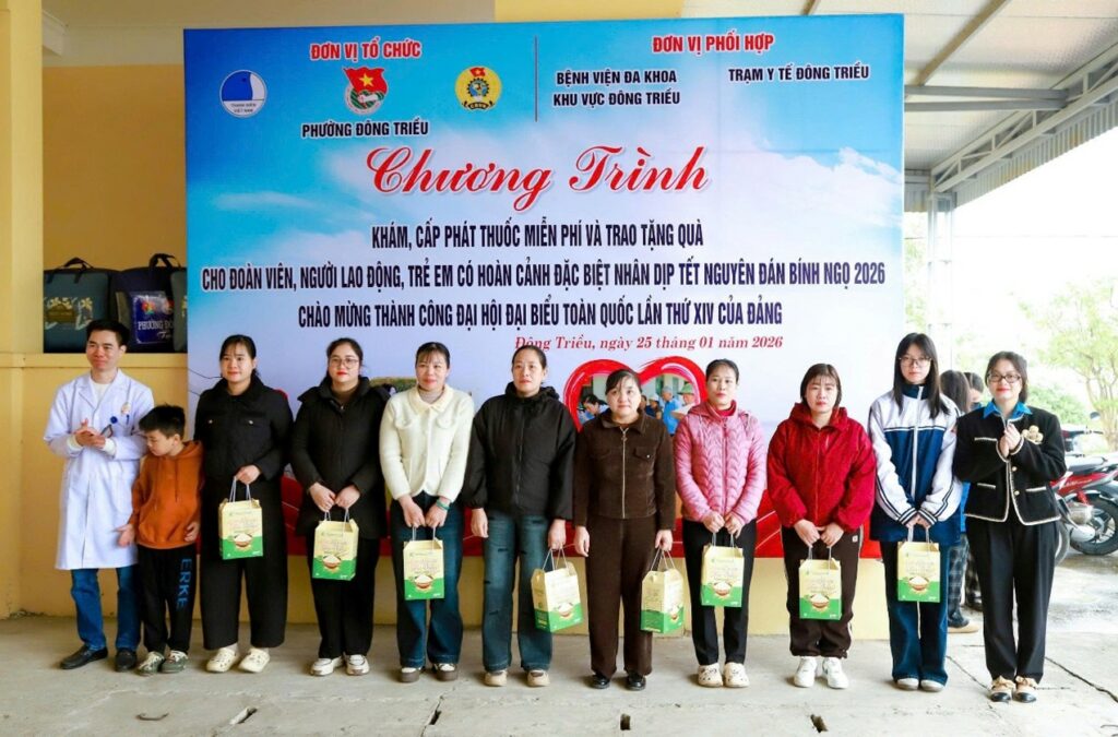 Chào mừng thành công Đại hội đại biểu toàn quốc lần thứ XIV của Đảng, sáng ngày 25/01, tại Trạm Y tế phường Đông Triều, Công đoàn phường phối hợp tổ chức chương trình khám, cấp phát thuốc miễn phí và trao tặng quà Tết nguyên đán Bính Ngọ 2026 cho đoàn viên, người lao động và trẻ em có hoàn cảnh đặc biệt trên địa bàn phường.