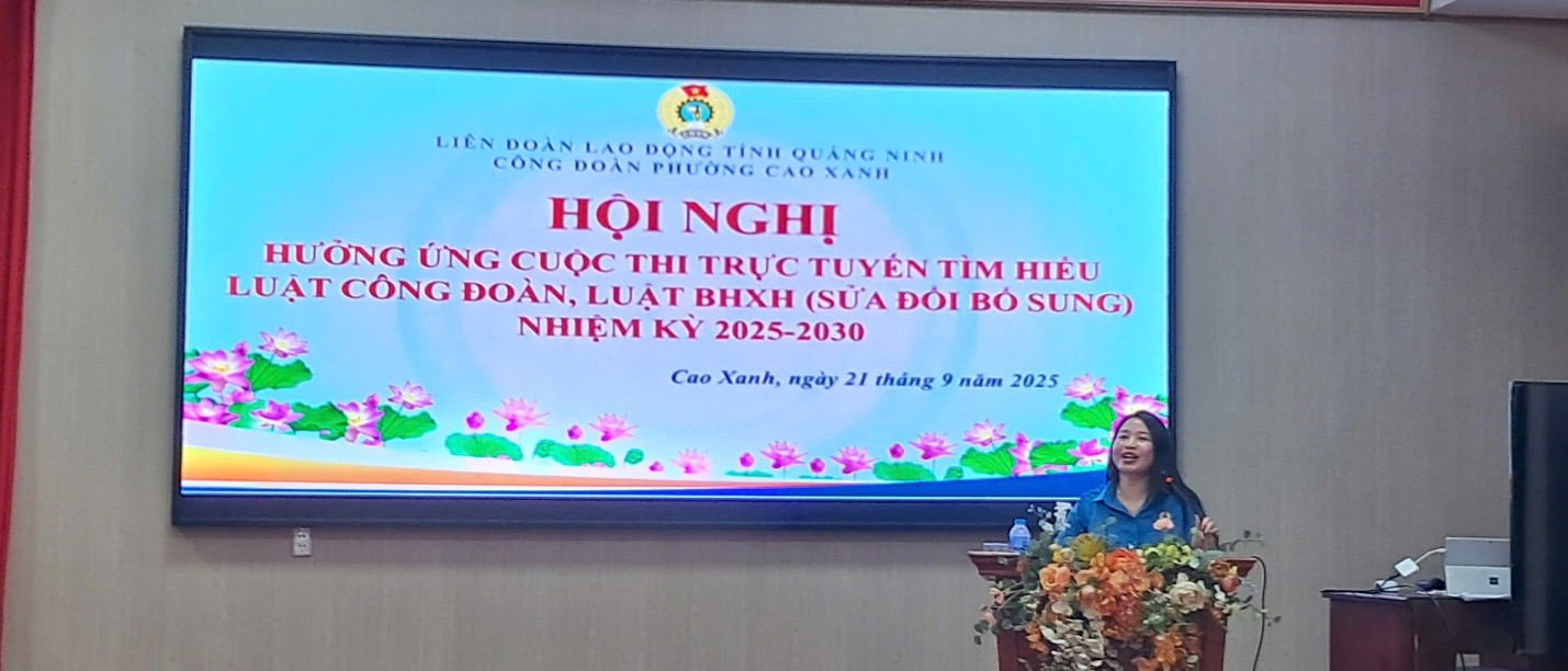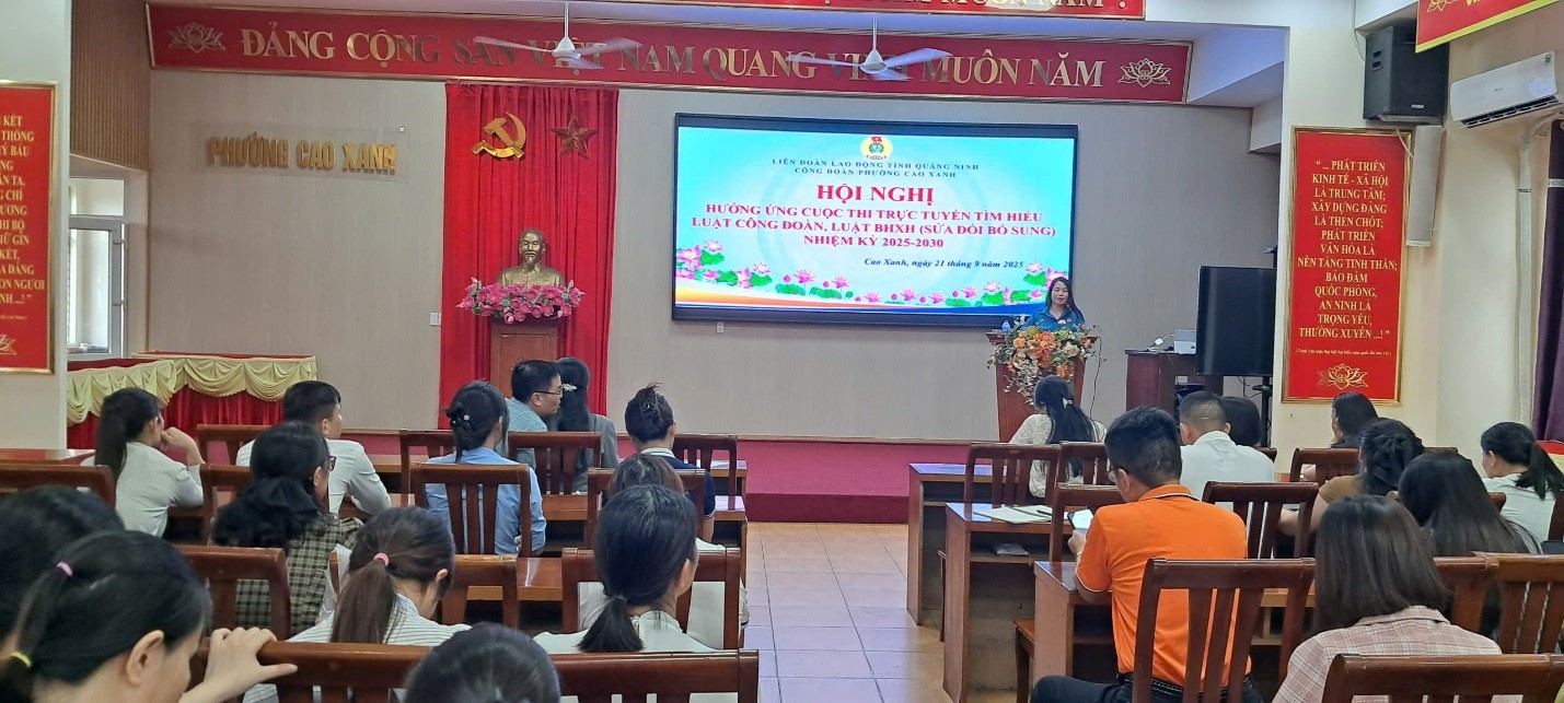 Thực hiện Kế hoạch số 1240/KH-LĐLĐ ngày 22/7/2025 của LĐLĐ tỉnh Quảng Ninh về hưởng ứng cuộc thi trực tuyến “ Công nhân, viên chức, lao động tìm hiểu Luật Công đoàn và Luật BHXH” , vừa qua, tại Hội trường Đảng ủy Phường Cao Xanh. Công đoàn phường Cao Xanh tổ chức hội nghị hưởng ứng cuộc thi trực tuyến tìm hiểu luật Công đoàn, Luật BHXH sửa đổi bổ sung.