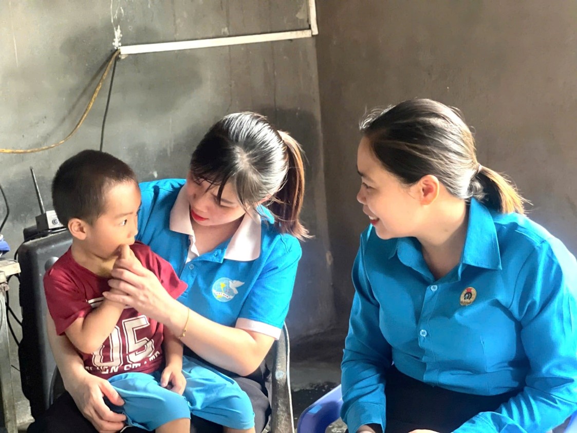Lãnh đạo Công đoàn và Hội LHPN xã ân cần thăm hỏi em Khương và gia đình