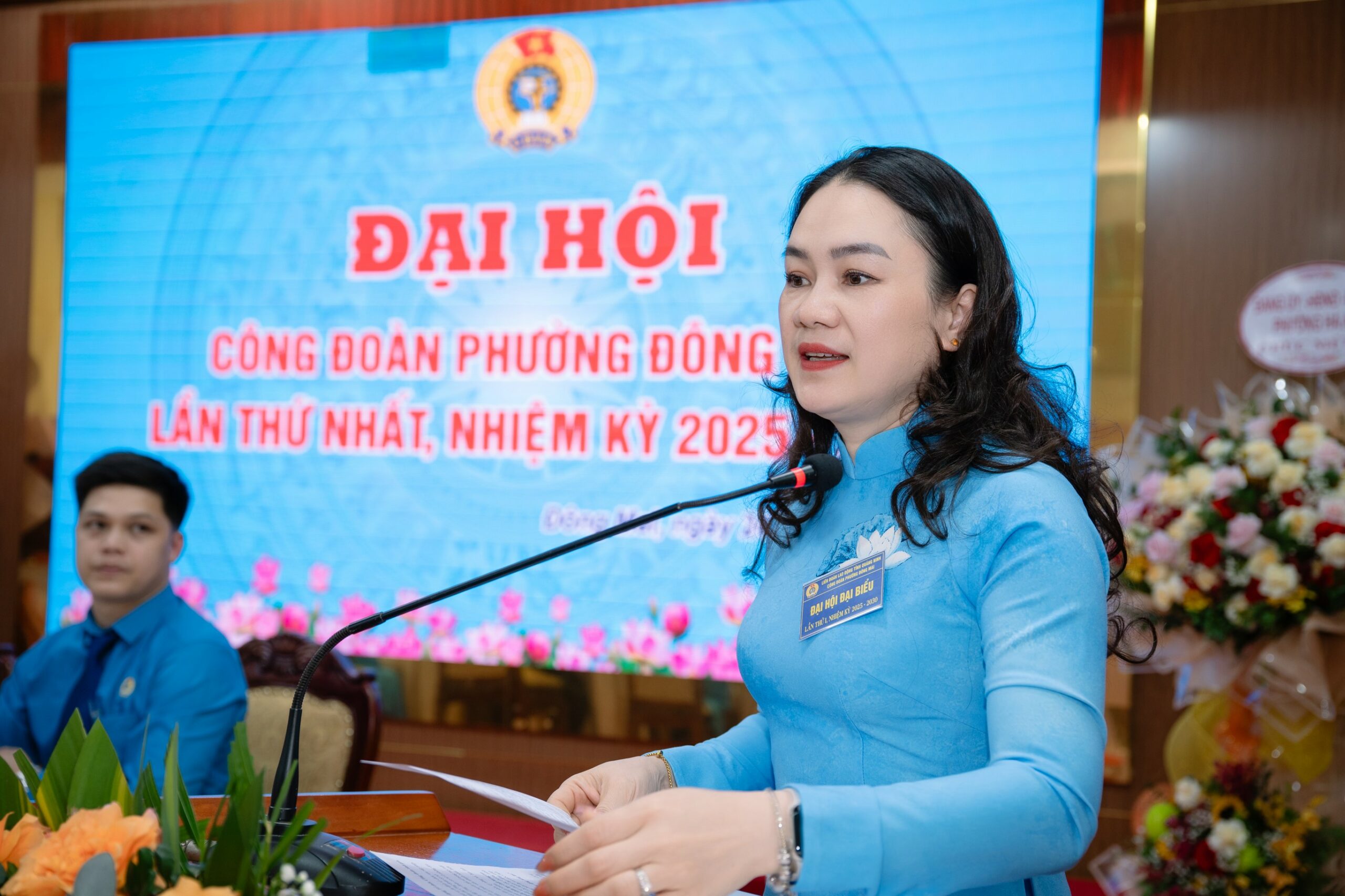 Phát biểu chỉ đạo Đại hội, đồng chí Hoàng Thị Hồng Phấn – Phó Chủ tịch Liên đoàn Lao động tỉnh Quảng Ninh ghi nhận và biểu dương nỗ lực của tập thể cán bộ, đoàn viên công đoàn phường Đông Mai trong thời gian qua; đồng thời đề nghị Ban Chấp hành khóa mới tiếp tục đổi mới nội dung, phương thức hoạt động, ứng dụng chuyển đổi số trong quản lý đoàn viên, tài chính và truyền thông; nâng cao chất lượng đội ngũ cán bộ công đoàn, phát huy vai trò đại diện, bảo vệ người lao động, góp phần xây dựng tổ chức công đoàn ngày càng vững mạnh.