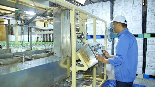 Công nhân vận hành dây chuyền sản xuất nước khoáng hiện đại.
