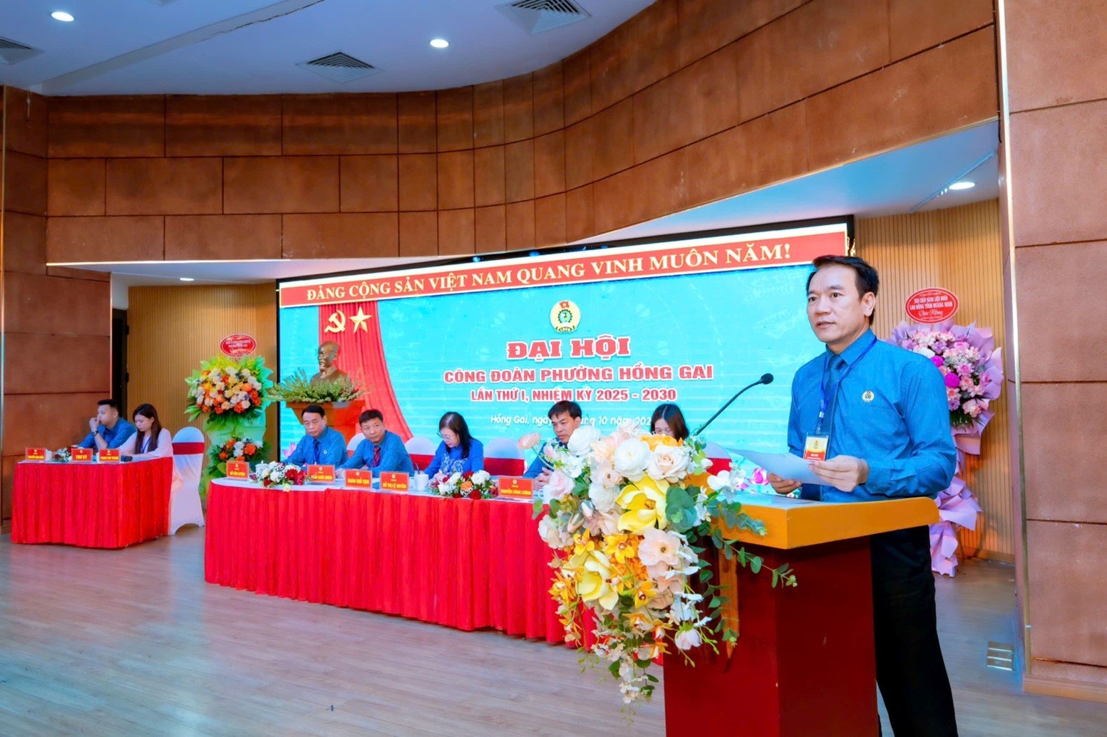 Đ/c Tô Xuân Thao, Ủy viên Đoàn Chủ tịch Tổng LĐLĐ Việt Nam, Tỉnh ủy viên, Phó Chủ tịch MTTQ Việt Nam tỉnh, Chủ tịch LĐLĐ tỉnh phát biểu chỉ đạo tại Đại hội Công đoàn phường Hồng Gai